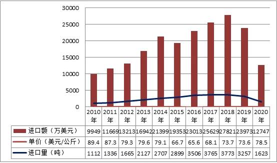 根據我國海關總署公布的數據顯現,2020年我國共進口光纖用高純石英管1622.941噸,進口額1.275億美元,與2019年同期相比進口量、進口額減少了一半。進口價格約78.5美元/公斤,較2019年提高了6.7%。