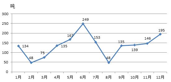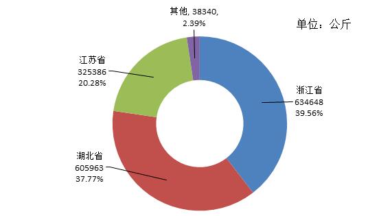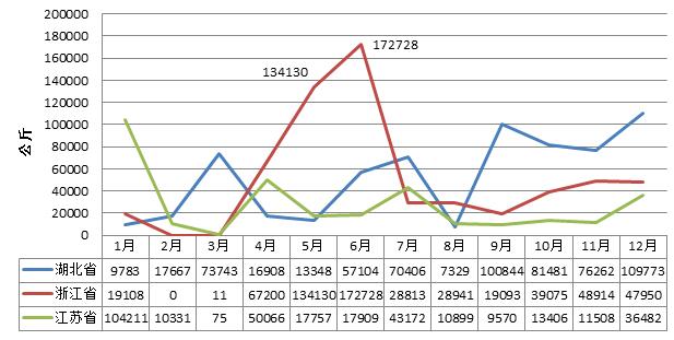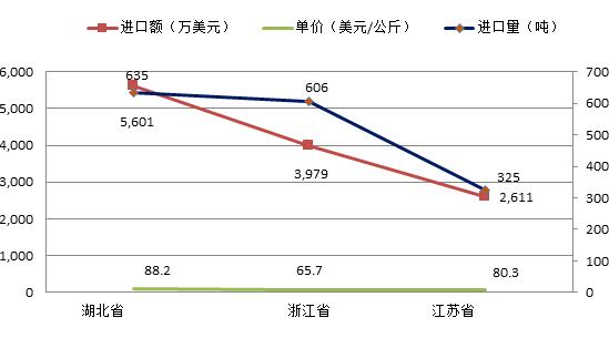 由圖6可以看出,湖北省和江蘇省月度進口量相對比較均衡,而浙江省則集中在5月和6月,共進口了307噸石英管,逾越全省全年進口總量的一半,遠遠高于其他月份。