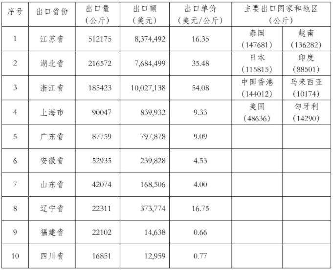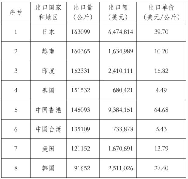 在出口國家和地區中,我國出口到日本的量最大,為163.099噸,出口額647萬美元。到越南的出口量與日本的出口量非常接近。各出口國家和地區的狀況如表1所示。